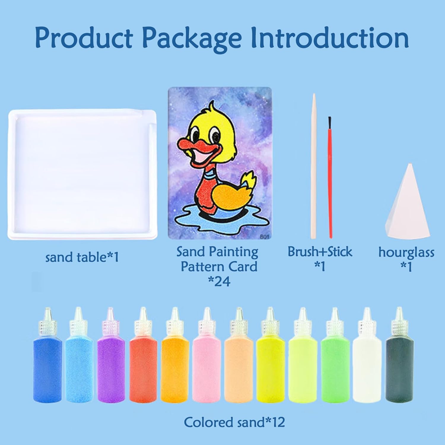 تأتي مع لوحة رسم ذاكرة، فرشاة خاصة، وعصا للتصميم لمنع تناثر الرمل. يمكن استخدام القمع الورقي لإعادة الرمل المتبقي بسهولة للزجاجة.