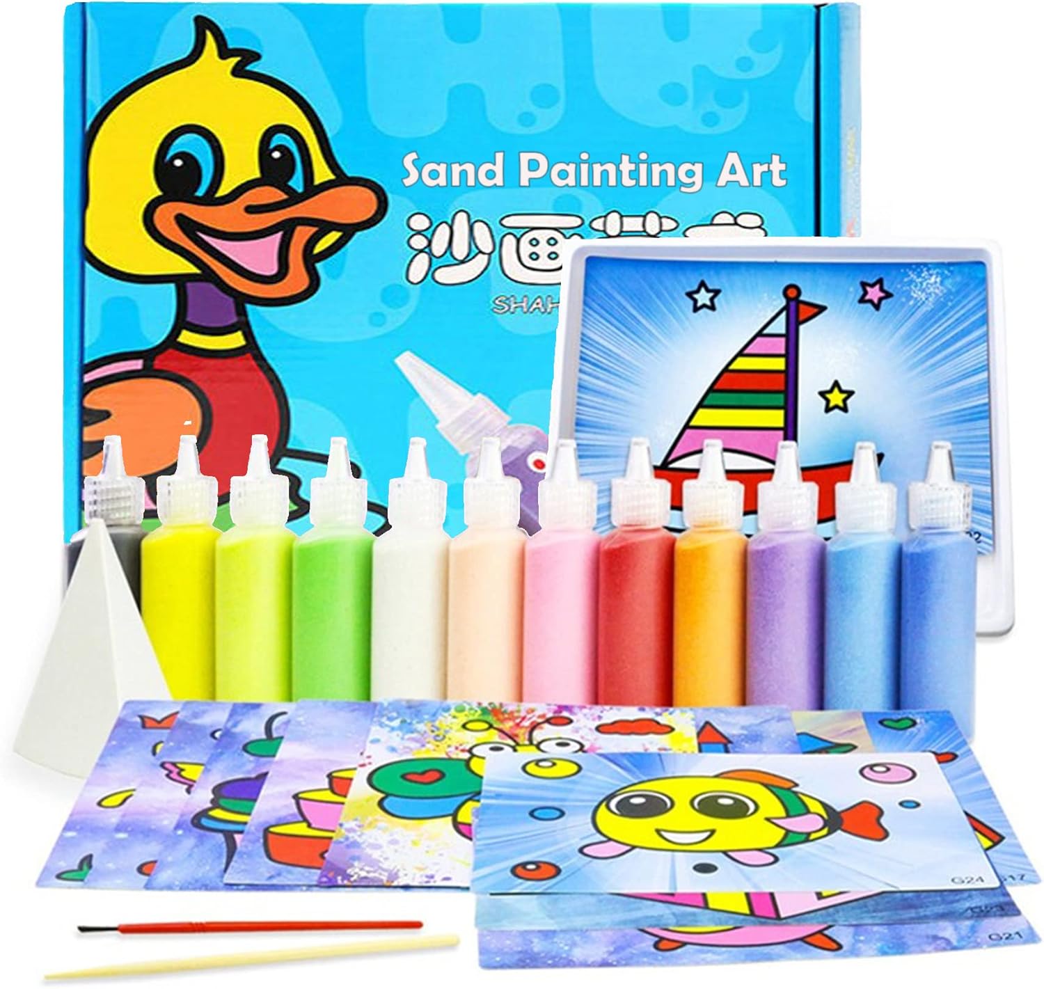 مجموعة الرسم بالرمل للأطفال من كايسينسوك – 24 ورقة + 12 زجاجة رمل ملون